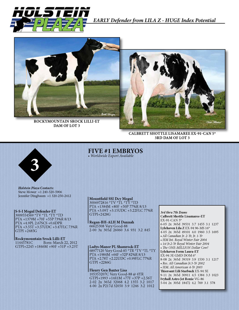 Five #1 grade EARLY Defender embryos with HUGE Index potential from the Lila Z cowfamily! PA-GTPI >2360 with 3.4T!